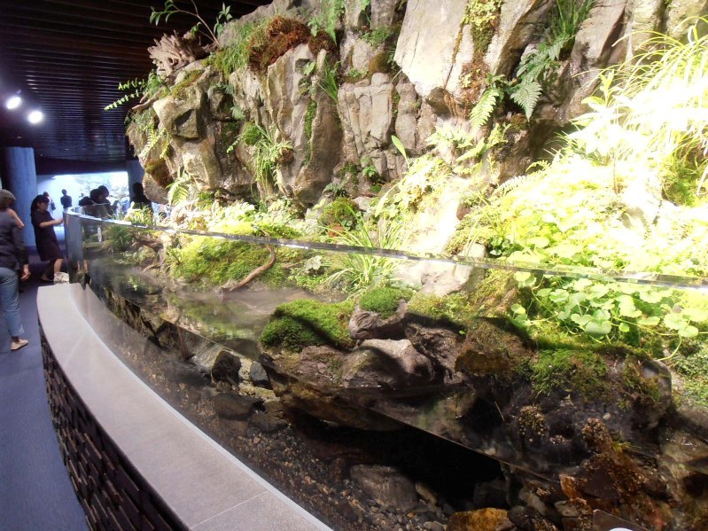 ■全国最大規模の内陸型水族館、京都市に出現 今年3月、京都市のど真ん中に京都水族館がオープンしました。内陸型の水族館としては全国最大規模。京都の新たな注目スポットとして、地元の方々を中心に、連日たくさんの来館者が詰めかけます。 今回京都水族館を訪れて、多くの見どころを取材することができましたが、ここでは二つのポイントに集約してご紹介します。まず一つめは、省エネ、省スペース、再利用などのエコ機能を最大限に駆使した“スマート水族館”であること。もう一つが、いきものの生態を軸にして見せる展示手法です。 同館企画営業部係長の奥村さんにご案内いただきました。 水族館は、大量の海水を必要とします。特に、内陸型の水族館では海水をタンクローリーで運搬しなければなりませんが、同館では「人工海水製造システム」を導入することによって、自前で海水をまかなうと同時に、運搬にかかるエネルギー(CO2)を削減しました。100%人工海水の水族館は全国でも初めてとのこと。 「人工海水は、雑菌が少なく、安定した水質を保てるというメリットがあります。透明度も高く、いきものがとてもきれいに見えます」と奥村さんは言います。 そして、この水質を保つのに活躍しているのが、高性能のろ過システムを持つ「節水型ろ過システム」。「通常、水族館では水槽水の1割ほどの水を毎日補給します。これは大変な水量です。当館では、貴重な水をできるだけ節約、再利用するため、このシステムを導入。おかげで補給する人工海水は最大1%に抑えることを目指せるようになりました」と奥村さん。水槽の排水はさらにろ過して、ろ過フィルターなど設備機器の洗浄に使われます。水を慈しむ心が、こうした再利用への徹底的な姿勢にも感じられますね。 ■省エネ、省スペース。まさに“スマート水族館” 巨大なイルカスタジアムの大屋根には、客席からは見えませんが、一面に太陽光発電のパネルが張りめぐらされています。最大60Kwの発電が可能といいます。これは、石油に換算すると、年間約1万5,000リットル分に相当します。また、イルカプールの水温は夜間電力を利用して調整することで、エネルギーの効率化を図っています。 ほかにも、省エネのための取り組みは隅々まで見られます。水をミスト状にして噴霧し、空気中から気化熱を奪って気温を下げるミスト空調、ガラスルーバーによる自然換気システム、雨水利用にLED照明……。 もともと、京都水族館の建築には、日陰規制と埋蔵文化財の保護のため、上にも下にも空間に大きな制約がありました。これだけの規模の水族館になれば、設備機器の占めるスペースも相当な規模になりますが、そうなると展示スペースに影響が出てしまいます。そこを京都水族館は、人工海水製造システムや節水型ろ過システムはじめ、多くのエコな取り組みによってクリアし、省エネ、省スペースを実現。コンパクトでありながら充実した展示内容を持つ水族館となったのです。「まさに時代が生んだ、“スマート水族館”だ!」と思わずにはいられませんでした。