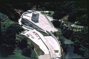 ■深い森に眠る古墳群を見渡す博物館 木々が深く生い茂る、曲がりくねった山道を歩いていると、重なり合った枝のすき間から白く大きなものが見え隠れし始めます。 そして視界が開けると、突如目の前に現れるコンクリートの不思議な物体。大阪府立近つ飛鳥博物館です。 大阪府の古墳の宝庫、南河内。奈良県との県境に位置する河南町・太子町にある史跡公園、「近つ飛鳥風土記の丘」には、 日本を代表する群集墳・「一須賀(いちすか)古墳群」 が保存されています。 公園といっても、イノシシやマムシが日常的に出没する、自然あふれる深い森におおわれています。 29haの園内には6世紀前葉から7世紀前葉の古墳が、確認されているものだけでも102基、群をなすように集まっています。園内の山道を散策していると、積まれた岩や小高い盛り土がそこここに見受けられます。 これは全部、千数百年前の古墳なのです。 これら貴重な遺跡の調査・研究の成果を展示し、教育的価値を付与した施設として、1994(平成6)年、園内の一角に近つ飛鳥博物館が建設されました。 設計は、大阪生まれの世界的建築家・安藤忠雄氏。コンクリートの質感と個性的な造形が特徴です。一見無機質なコンクリート建築ですが、多数の古墳が眠るうっそうとした山林の中にあって、その自然になぜか溶け込んでいるのも安藤建築の独自性でしょう。 同館企画管理課課長の川中秀樹さんはこういいます。「来館者の方々は、やはり博物館の建物自体に驚きの声をあげられますね。でも、見慣れてくると、この異質で奇抜な形が風景と溶け合っていることがわかるんです。不思議ですね」。 ■人を黄泉の国へといざなう 「現代の古墳」 安藤氏は、この博物館の姿を 「古墳と同じく空に向けたファサードの表現」を持つ「現代の古墳」と表現しています。 確かにそう思って見ると、なんだか巨大な遺跡のように見えてきます。 墳墓と同じように、出土した埋葬品を保存した展示室の大部分を地下に埋設し、 階段状の屋根で覆っています。 この階段も、まるで墳墓の斜面を思わせます。そして湾曲する壁面。 これらが周囲の起伏によくなじんでいるのです。 階段屋根の中央には、窓のない大きな塔(30m)がそびえています。 その名も 「黄泉(よみ)の塔」。 黄泉は、古事記や日本書紀などで描かれる死者の国のことです。安藤氏は、「建物内部に入るとき、人々は古墳内部に入っていくのと同様な感覚を体験できる。それは古代の黄泉の国への旅である」 と語っています。 わくわくしながら中へ……というのも少し変ですが、古代、死者の住みかとなった古墳内部に入るというのは、何かしらロマンを感じます。